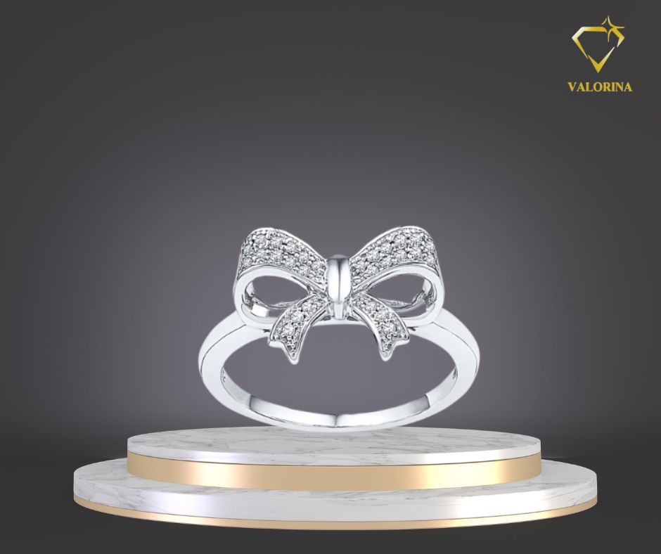 Lấy cảm hứng từ hình ảnh chiếc nơ mềm mại dưới ánh nắng đầu ngày, Nhẫn Bạc Nơ Ánh Bình Minh – Valorina mang đến phong cách dễ thương nhưng vẫn sang trọng. Các viên đá được đính tinh xảo tạo hiệu ứng lấp lánh dịu nhẹ, giúp bàn tay thêm phần rạng rỡ và thu hút.